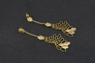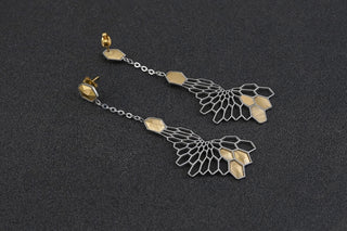 This new collection gives the first edition interconnected design motion in action with small sleek dangling chains from the dodecahedron honeycombed studs.